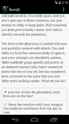 What if you had to survive in a zombie apocalypse? In this riveting interactive novel, you make the story. Save your parents? Or let them die… Alliances or murder? Its your choice, choose carefully or it’ll be your last.