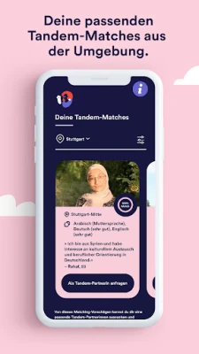 Finde deine perfekte Tandem-Partnerin! Wir matchen dich nicht nur nach Standort und Alter, sondern berücksichtigen auch Interessen, Fähigkeiten und deine Präferenzen für Treffen.