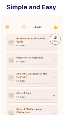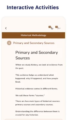 • Organized Learning Path: Learn key topics such as ancient empires, world wars, and social movements in a structured sequence.