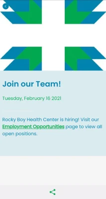 The Rocky Boy Health Center app is the official mobile app for Rocky Boy Health Center. It promotes health and wellness among the American Indian community in Rocky Boy, Montana, through announcements, articles, events, videos, and other content.