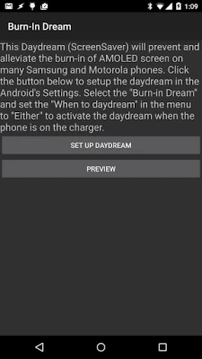 on devices with AMOLED screen. Once you set up the daydream, it will automatically run if you leave the device on with the charger plugged in. This app will prevent the permanent burn-in damage to the screen if it is exercised frequently.