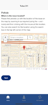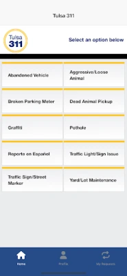 Want to report a pothole, broken traffic signal, or graffiti while you are out and about? The Tulsa311 App makes reporting issues like these easier than ever! The app uses GPS to identify your location and also allows you to snap a photo to add to your service request. Requests are automatically sent to the servicing department in Tulsa City Council for resolution. You will be able to follow your issue from the time it is reported until it is resolved.