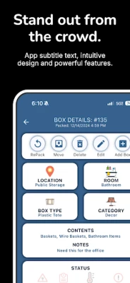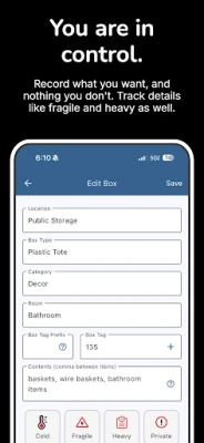 Easily find any box or specific item. Customize box statuses to flag items as heavy, fragile, or temperature-regulated. Share box details or pictures via text message or email.